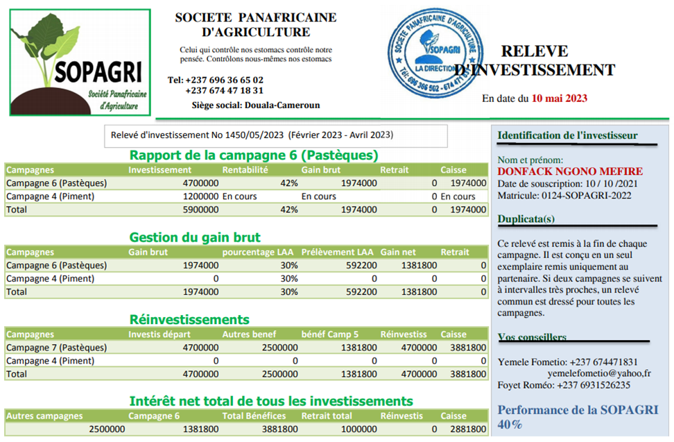 Cette partie du document a 4 sections. La première section concerne l’identification de l’investisseur. Elle précise son nom, sa date de souscription à la SOPAGRI et son numéro matricule. Dès l’arrivée de l’investisseur dans la SOPAGRI, sa date est relevée et précisée dans chacun de ses relevés d’investissement. Un numéro matricule unique lui est attribué. La deuxième section précise les informations sur le caractère unique et secret de ce relevé d’investissement. En fait, la SOPAGRI ne peut donner le relevé d’investissement d’un partenaire à une tierce personne, sauf en cas d’entente avec le partenaire. La troisième section concerne les conseillers de la SOPAGRI. Il s’agit des dirigeants de la SOPAGRI qui sont disponibles pour répondre à toutes les sollicitations ou problèmes des partenaires. Les noms des conseillers et leurs contacts sont précisés dans les relevés d’investissement. La dernière section concerne la performance de l’entreprise. Il s’agit de sa rentabilité globale. Ce chiffre est donc variable en fonction des diverses fluctuations dans l’entreprise.