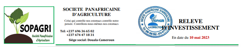 L’entête est divisée en deux parties. A droite du document, nous avons la SOPAGRI et ses coordonnées. Il y a le logo de l’entreprise, son nom, sa devise, les contacts et la précision du siège social. A gauche nous avons le titre du document sa date de conception.
