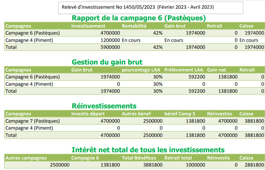 Elle se subdivise en 5 sections. La première section donne le numéro du relevé d’investissement et la date de couverture de cette campagne. La deuxième section fait le rapport d’investissement du partenaire dans la campagne dont on fait le relevé d’investissement. La première colonne montre les campagnes où l’investisseur a mis ses fonds. La deuxième colonne est celle des investissements. Elle montre le montant du capital investi. La troisième colonne est celle de la rentabilité de chaque campagne. Dans l’image ci-dessus, le taux de rentabilité est de 42 %. Les campagnes n’ont pas les mêmes durées de production. Au cas où les fonds sont investis dans deux campagnes à inégale durée, la colonne des investissements précise le montant investi dans la campagne en cours pour que l’investisseur puisse voir tout son investissement dans son relevé d’investissement. Mais les autres colonnes ont juste la mention « En cours », puisqu’on ne peut pas encore faire les calculs d’une campagne inachevée. Dans la colonne des rentabilités, le pourcentage qui y est mentionné exclut les charges et les salaires. Autrement dit, le taux exact de rentabilité de la campagne 6 (pastèques) donnée en exemple dans l’image ci-dessus est 70%. C’est en prélevant les salaires et autres charges qu’on se retrouve à 42% de rentabilité. La quatrième colonne calcule le gain brut net de l’investisseur, ce que lui ont rapporté ses investissements sans les prélèvements de la Ligue Associative Africaine. La cinquième colonne concerne ses retraits, et la sixième colonne concerne ce qui est dans sa caisse à la suite de la campagne. Il ne s’agit pas de tout ce qui est dans sa caisse, mais seulement de ce que la campagne a ajouté à sa caisse.