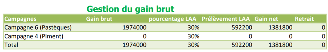 La gestion des gains bruts se présente aussi en un tableau de 6 colonnes. La première colonne rappelle les campagnes où le partenaire a investi ses fonds. La colonne 2 revient sur les gains bruts générés par chaque campagne achevée. La troisième colonne rappelle le pourcentage que la Ligue Associative Africaine doit prélever dans ce gain tel que précisé dans le contrat de partenariat. Pour rappel, la SOPAGRI est une société de la Ligue Associative Africaine. L’un de ses principaux buts est de soutenir le combat de la renaissance Africaine tout en permettant aux partenaires de fructifier leurs revenus. La Ligue Associative Africaine prélève donc 30 % du bénéfice de chaque partenaire à la fin de chaque campagne. En retour, la Ligue Associative Africaine soutient certaines actions de la société et s’occupe de la promotion de la société. La quatrième colonne précise le montant exact que la Ligue Associative Africaine a prélevé sur le bénéfice du partenaire. La cinquième colonne donne le gain brut du membre après le prélèvement de la Ligue Associative Africaine. La dernière colonne montre les retraits effectués par le partenaire lors de ces campagnes qui viennent de s’achever. Dès le début des récoltes, un partenaire en difficulté financière peut demander une avance sur ses bénéfices. La somme retirée sera donc mentionnée dans les retraits.