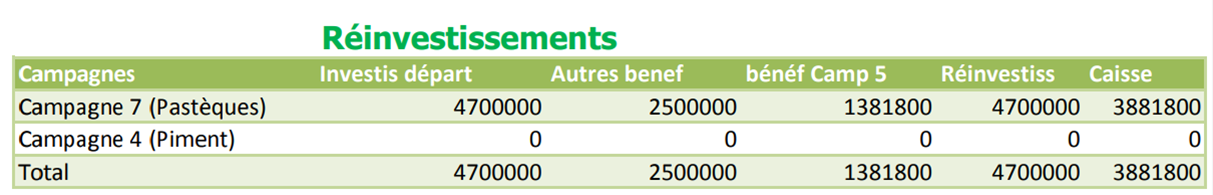 Pour les réinvestissements, il s’agit de montrer au partenaire dans quelle campagne ses fonds ont été réinvestis. La première colonne de cette section rappelle les campagnes lancées ou qui sont sur le point d’être lancées. La deuxième colonne rappelle l’investissement de départ. Au cas où le partenaire augmente ses investissements au cours de l’évolution de la société, l’investissement de départ inclura tous ces ajouts. La troisième colonne concerne l’investissement des autres bénéfices. Il s’agit des bénéfices que le partenaire a accumulé avant la campagne passée. Au cas où ces bénéfices sont investis, la somme est précisée à la troisième colonne. La quatrième colonne concerne le réinvestissement du bénéfice de la campagne dont le relevé d’investissement est dressé. La cinquième colonne montre la somme totale investie dans la campagne en cours ou à lancer. La sixième colonne quant à elle montre le montant total de la caisse du membre après les réinvestissements. Il peut retirer de l’argent dans sa caisse à tout moment s’il en a besoin.