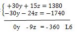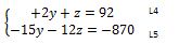 Nous avons donc deux lignes de plus sans x, seulement avec les y et z. En effet, les lignes 4 (L4) et les lignes 5 (L5) ne possèdent pas de x, mais seulement de y et de z. Le pivot nous a donc permis d’annuler un inconnu. On a donc les nouvelles équations cette fois avec deux inconnus au lieu de trois. On va donc réunir ces deux équations pour annuler encore un inconnu (entre y et z). On va chercher à annuler les y.