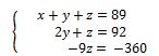 Nous avons déjà y et z. Nous allons sur la ligne 1 de notre système d’équations triangulé pour remplacer y et z par leurs valeurs respectives afin de trouver x.