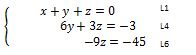 L1 : x+y+z=0 -2+(-3)+5=0 -2-3+5=0 -5+5=0 0=0 La ligne 1 vérifie