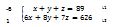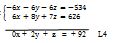 Faisons la multiplication. Celui qui est dehors (hors des accolades) multiplie tous ceux qui sont à l’intérieur. -6 va donc multiplier toute la ligne 1, et 1 va aussi multiplier toute la ligne 2. A la ligne 1, -6 va donc multiplier x, y, z et 89. A la ligne 2, 1 va multiplier 6x, 8y, 7z et 626.
