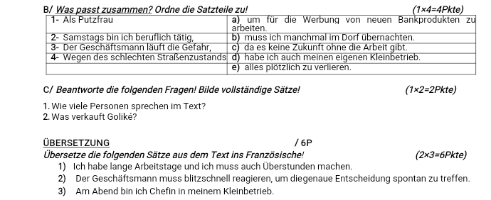 Tidiké, 31: Nach meinem Abitur habe ich eine fünfjährige Ausbildung an einer Handelsschule gemacht. Heute bin ich Bankkauffrau bei einer bekannten Bank. Ich verdiene zwar gut, aber das geht nicht ohne Schwierigkeiten. Ich habe lange Arbeitstage und ich muss auch Überstunden machen. Am Samstag bin ich auch beruflich tätig. Ich arbeite für die Werbung von neuen Bankprodukten.