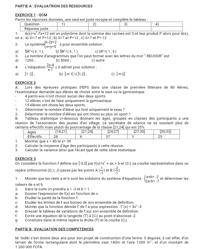 Epreuves Mathématique 1ère A4