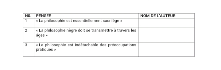 2. Recopie et complète le tableau suivant en faisant correspondre chaque pensée à l’auteur indiqué : MARCIEN TOWA, BASILE JULEAT FOUDA, EBENEZER NJOH MOUELLE (3pts)