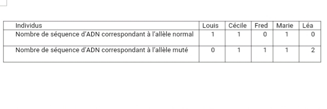 3- Une technique très récente a permis de repérer dans l’ADN des individus, deux longues séquences de nucléotides caractéristiques d’un gène donné. C’est ainsi que cette technique a permis d’obtenir les résultats des tests de certains membres de cette famille (voir tableau ci-dessous).