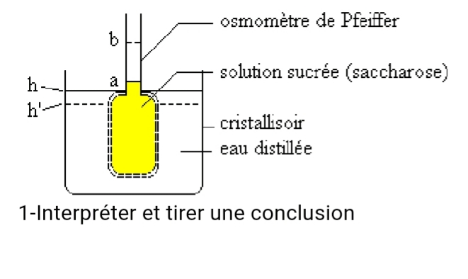 On adapte un tube en verre à un flacon en porcelaine poreuse dont les pores sont bouchés par un précipité de ferrocyanure de cuivre. Un tel dispositif est appelé osmomètre de Pfeiffer. L’osmomètre est rempli d’eau sucrée et plongé dans un cristallisoir rempli d’eau distillée. Le niveau de la solution sucrée monte de a à b et s’y stabilise. Le niveau de l’eau pure dans le cristallisoir baisse de h à h’ et y reste.