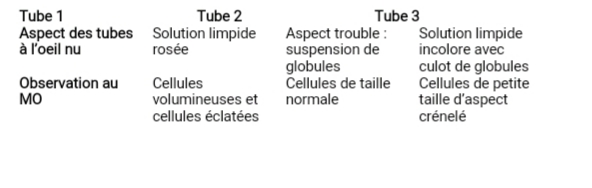 12 ml d’une suspension de globules rouges placés dans une solution de NaCl à 0,9 % (9 g/l), pH = 7,4 sont répartis à part égale dans trois tubes. On ajoute à chacun d’eux :