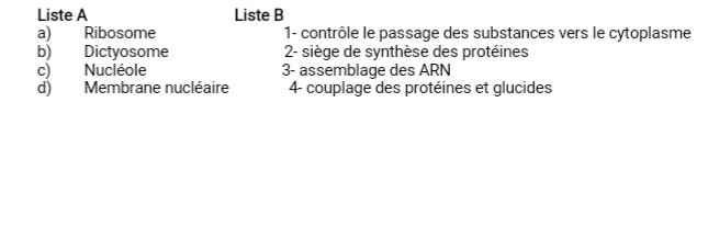 Pour cette question, l’élève fera correspondre les éléments de la liste A à ceux de la liste B en fonction des relations pouvant exister entre eux. La réponse sera présentée sous la forme d’un couple chiffre-lettre.
