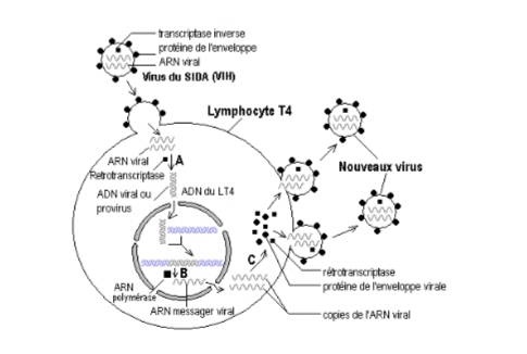 Le SIDA est une maladie due à un virus, le VIH (Virus de l’Immunodéficience Humaine). Ce virus possède une information ‘’génétique’’ originale : elle est constituée de deux molécules identiques d’ARN. Le virus se réplique dans les cellules immunitaires, les lymphocytes T4. Le cycle simplifié de réplication est donné dans le schéma du document 3.Pour se répliquer, ce virus se fixe sur un lymphocyte T4 et son enveloppe fusionne avec la membrane de la cellule. Le contenu du virus dont les 2 molécules d’ARN et diverses enzymes, est alors injecté dans le cytoplasme cellulaire. L’ARN est ensuite copié en ADN sous l’action d’une enzyme virale, la transcriptase inverse (c’est la rétro transcription). L’ADN viral pénètre dans le noyau de la cellule infectée et s’intègre dans l’ADN du lymphocyte. La transcription de l’ADN viral suit l’intégration. Les copies obtenues d’ARN viral passent dans le cytoplasme où elles sont traduites en protéines constitutives de l’enveloppe, en protéines enzymatiques … Finalement, chaque enveloppe formée renferme 2 molécules d’ARN viral et diverses protéines. Les nouveaux virus ainsi assemblés sortent de la cellule.