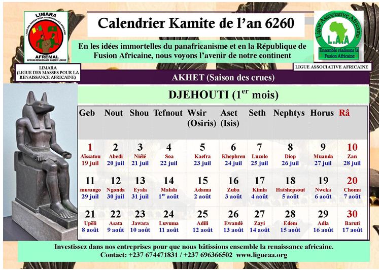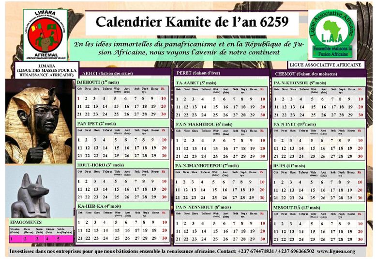 Résolument engagés dans le combat pour la Renaissance africaine, la Ligue Associative Africaine et la LIMARA ont fait un travail impressionnant durant leurs années d’existence (11 années pour la Ligue Associative Africaine et 8 années pour la LIMARA). Il faut une rupture épistémologique avec la pensée étrangère, pour renouer avec la pensée vivifiante de nos ancêtres. La pensée étrangère doit juste venir en renfort à notre pensée. Le travail de la renaissance nécessite la contribution de tous. Il est clair que la Ligue Associative Africaine et la LIMARA, tout comme les autres organisations kamites ou panafricaines ne réussiront jamais si les Noirs à travers la planète ne soutiennent pas financièrement ces organisations et s’engagent dans leurs rangs. Sans ce soutien, nous resterons au niveau des idées, et les organisations seront condamnées à la chute. La Renaissance est un vaste programme qui engage la destinée d’un peuple. La nôtre est nécessaire. Les Noirs ne seront jamais respectés dans le monde s’ils ne réalisent pas leur renaissance, et dans cette réalisation, chacun doit jeter sa pierre à l’édifice. La Ligue Associative Africaine attend aussi que vous investissiez dans ses structures économiques alliées. Ce calendrier kamite n’est qu’un article. Dans notre site web www.ligueaa.org, vous aurez des centaines d’autres articles. Le combat continue…