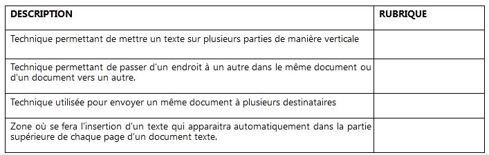 2. Dans le contexte du traitement de texte, vous disposez ci-dessous d’un tableau de correspondance DESCRIPTION/RUBRIQUE. Recopier et remplir le tableau en plaçant devant chaque description la rubrique correspondante de la liste suivante : En-tête, Lien hypertexte, Multicolonnage, Publipostage. 1pt