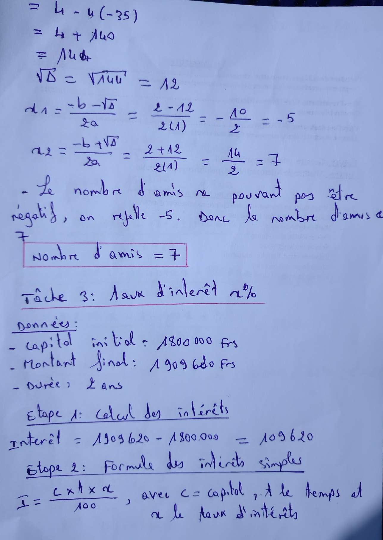 M. Ondoua, éleveur de chèvres et de moutons, voudrait faire des groupes de 3 bêtes. Les bêtes sont prises simultanément dans son cheptel de 21 animaux. Chaque groupe recevra une ration équivalente à un montant de 500frs. Afin de réunir la somme de 154.000frs représentant le montant nécessaire pour l'achat du matériel pour entourer son enclos, il fait appel à un groupe d'amis qui décident de cotiser de façon équitable. Mais au dernier moment, deux d'entre eux ont désisté, alors la part des autres amis restants a dû augmenter de 8.800frs. Etant prévoyant, M. Ondoua avait placé la somme de 1.800.000frs dans une microfinance à un taux d'intérêt de x%. Après deux années consécutives, il retire tout le capital ainsi que les intérêts produits pour un montant total de 1.909.620frs.