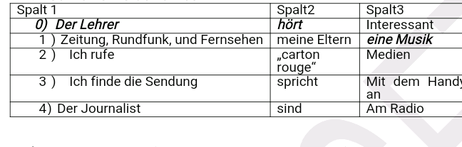 Thema1: Verbinde die Elemente von Spalt1, Spalt2, Spalt3 und bilde vier (04) kohärente Sätze wie im Beispiel (6 Pkt