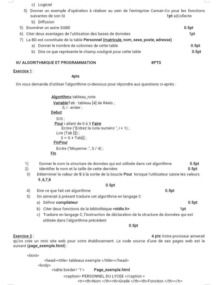 Épreuves informatique 1ère C