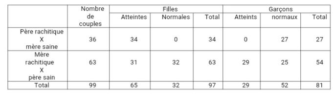 2- Le tableau ci-dessous montre la descendance de mères et pères atteints du rachitisme vitamino-résistant mariés à des conjoints sains.