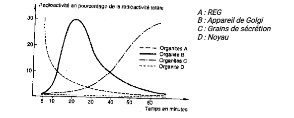 Pour comprendre la biosynthèse de la sécrétion de l’insuline, on injecte par voie intraveineuse à un cobaye une solution contenant un acide aminé rendu radioactif : la phénylalanine. On effectue des prélèvements de cellules sécrétrices d’insuline à intervalles de temps réguliers et on mesure l’intensité de la radioactivité au niveau de différents organites cellulaires. Le graphique ci-après traduit l’évolution de la radioactivité détectée en fonction du temps.