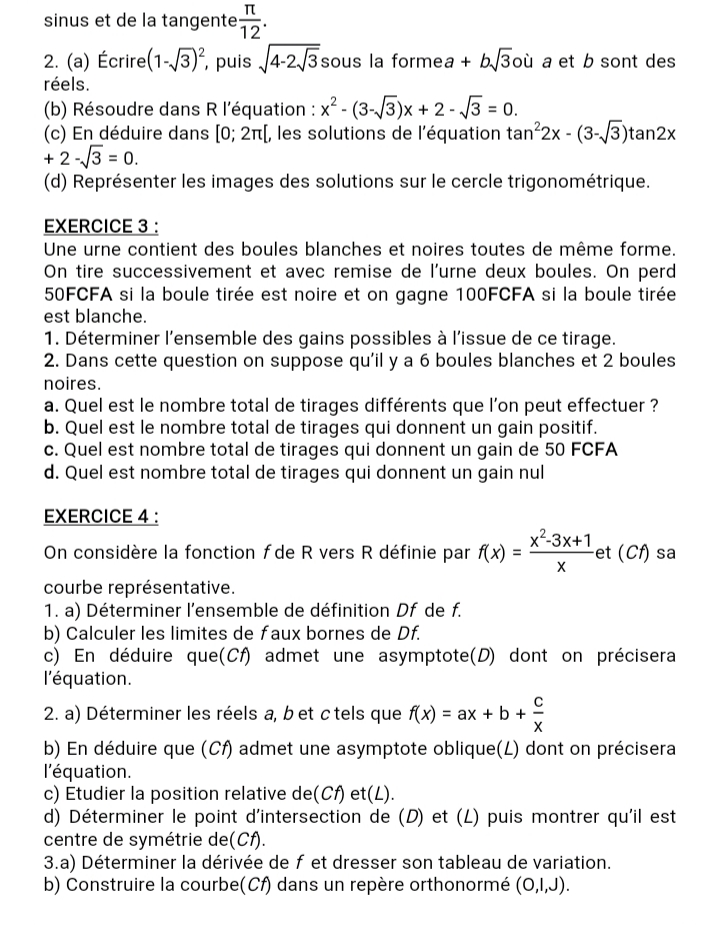 Epreuves Mathématiques 1ère D