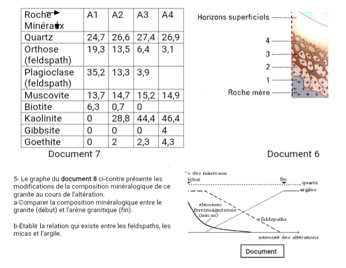 Quatre échantillons de granite plus ou moins altérés numérotés A1, A2, A3 et A4 ont été récoltés à des endroits différents d'un sol (document 6). Une étude comparative de leur composition minéralogique a été réalisée et les résultats sont consignés dans le tableau du document 7. Après analyse de ce tableau: