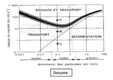 Le fond horizontal d'un chenal d'écoulement expérimental est tapissé de matériaux meubles dont la taille a été calibrée par tamisage. On crée un courant d'eau dont peut varier la vitesse et on observe le comportement des grains lors de différents essais. Le diagramme du document 9 ci-dessous a été établi expérimentalement par Hjuström.