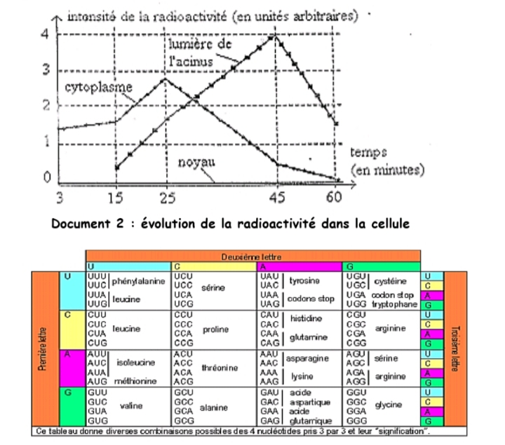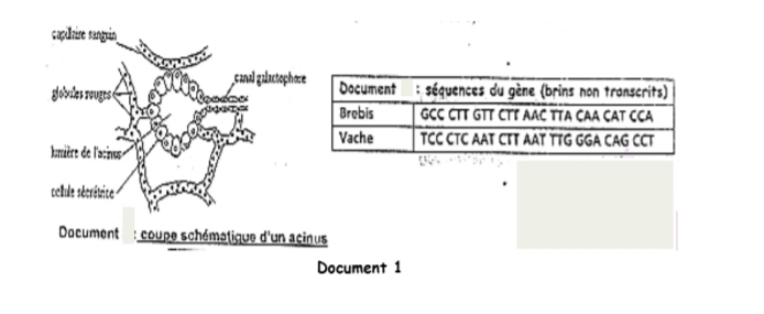 Le lait est sécrété par les cellules des glandes mammaires groupées en acini, avant d’être évacué par les canaux galactophores. Le document 1 représente la séquence des nucléotides des gènes codant les caséines, protéines les plus abondantes du lait. Afin de comprendre comment les caséines sont élaborées, des fragments des glandes mammaires de brebis sont placés pendant 3 minutes sur un milieu de culture contenant un acide aminé, la leucine radioactive, puis sur un milieu non radioactif. Des fragments de tissus sont prélevés 3, 15, 25, 45, et 60 minutes après que les cellules aient été placées sur le milieu non radioactif. Le graphique du document 2 traduit l’évolution de la radioactivité dans une de ces cellules.